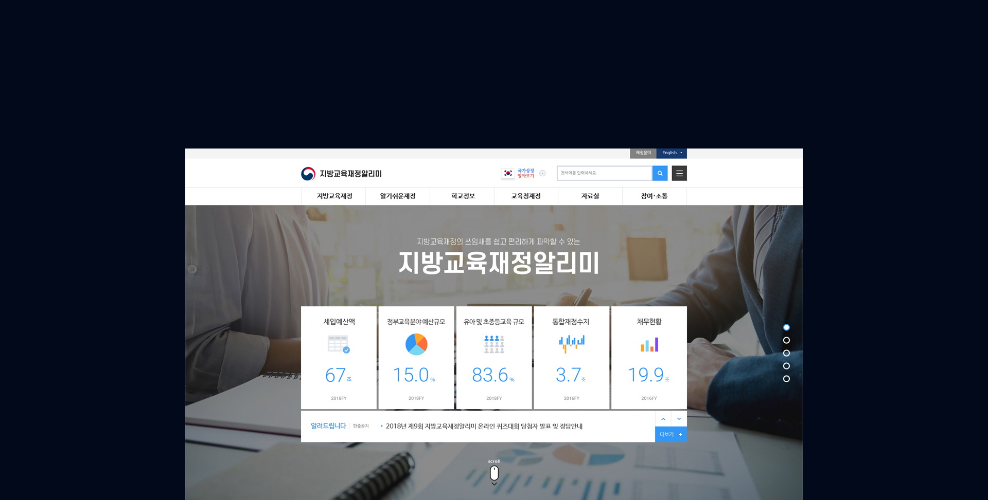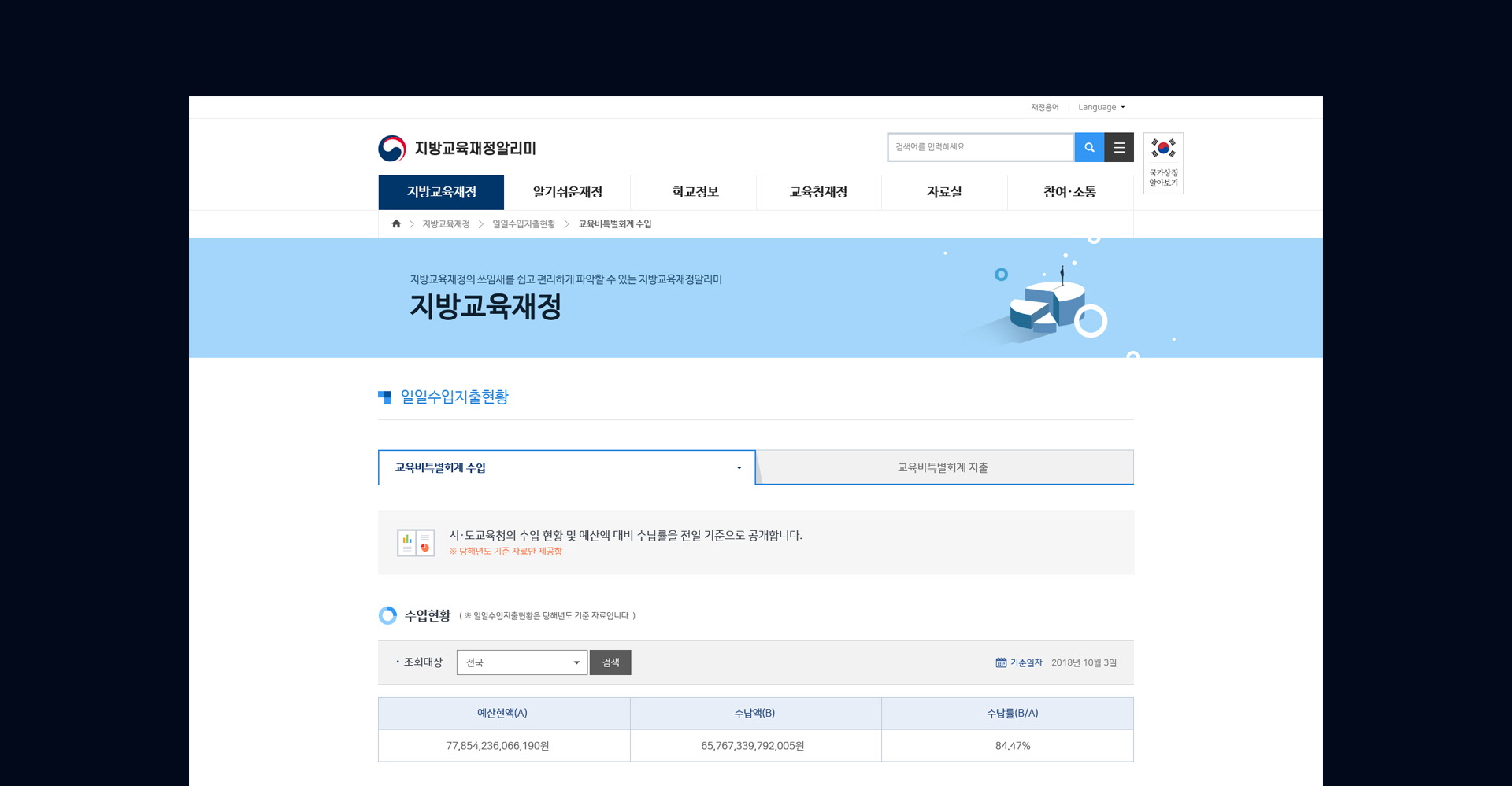국민들이 지방교육재정의 쓰임새를 한 곳에서, 한 눈에 쉽고 편리하게 파악할 수 있도록, 17개 시·도교육청의 재정정보와 자료를 통합 및 비교하여 제공하는 지방교육재정 공시포털 시스템